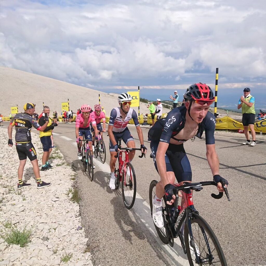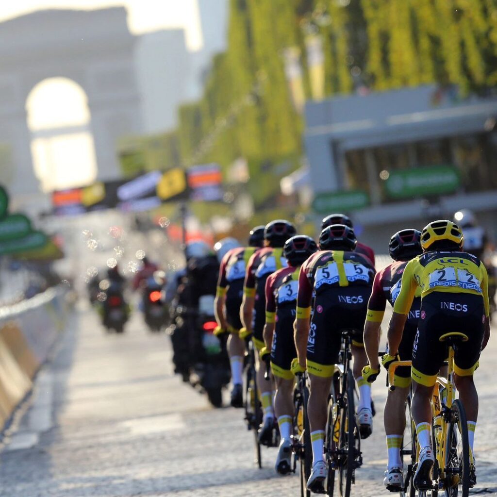 沿途會經過高山、丘陵、平地等等不同的區域,像是位於阿爾卑斯山上的Alpe d’Huez(圖2)、位於普羅旺斯最高點的Mont Ventoux(圖3)都是極具代表性的賽段。最後一段會在法國巴黎市區的香榭麗舍大道(圖4)舉行,因為到最後一段通常比賽結果已定,因此這段比起比賽更像是一場慶典。頒獎台也總是以凱旋門為背景(圖5)。