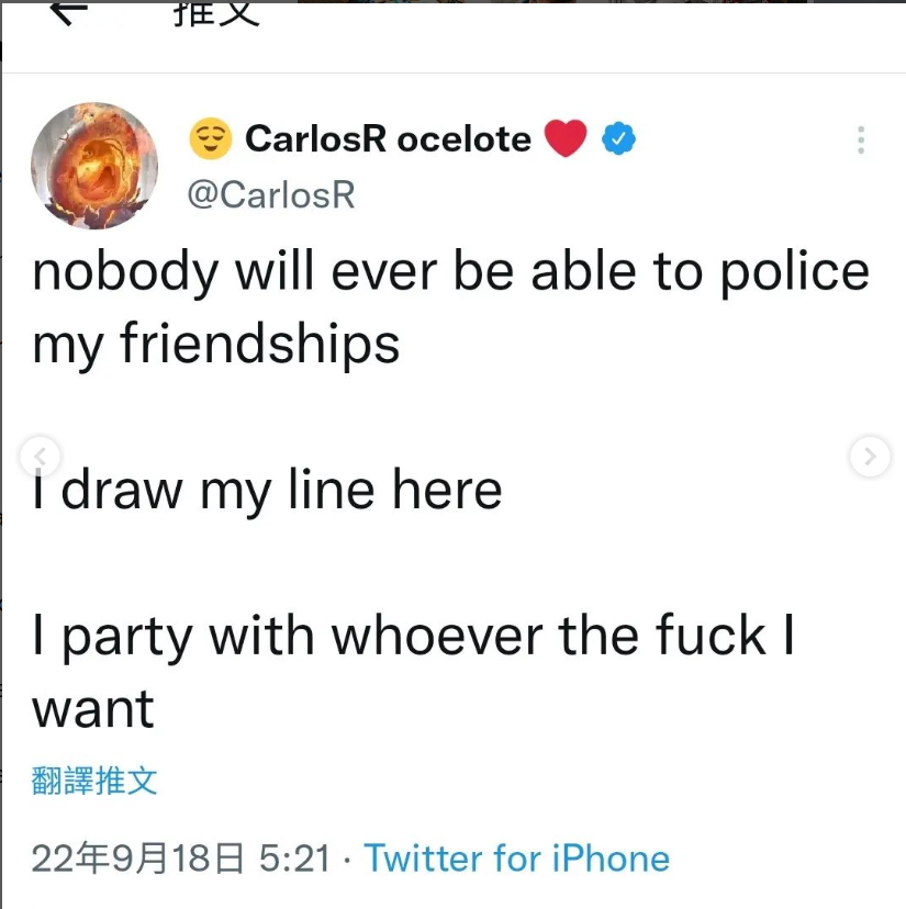 原因是上個禮拜,Carlos在twitter上傳了一支影片(圖1),內容是他與一群人在開趴,網友發現影片中有知名仇女網紅Andrew Tate(影片中光頭)(他不只仇女,還有一些調查中的犯罪行為,偏激言論也使的他被各大社群平台封殺)。影片一上傳,立刻遭到大批網友撻伐,電競圈也有許多人跳出來指責他的行為。
