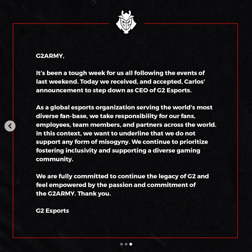 就在他發布貼文的幾天後,(可能是迫於股東給的壓力),Carlos上傳了道歉文並且G2也宣佈將會拔除他的CEO位置八週(圖3)。