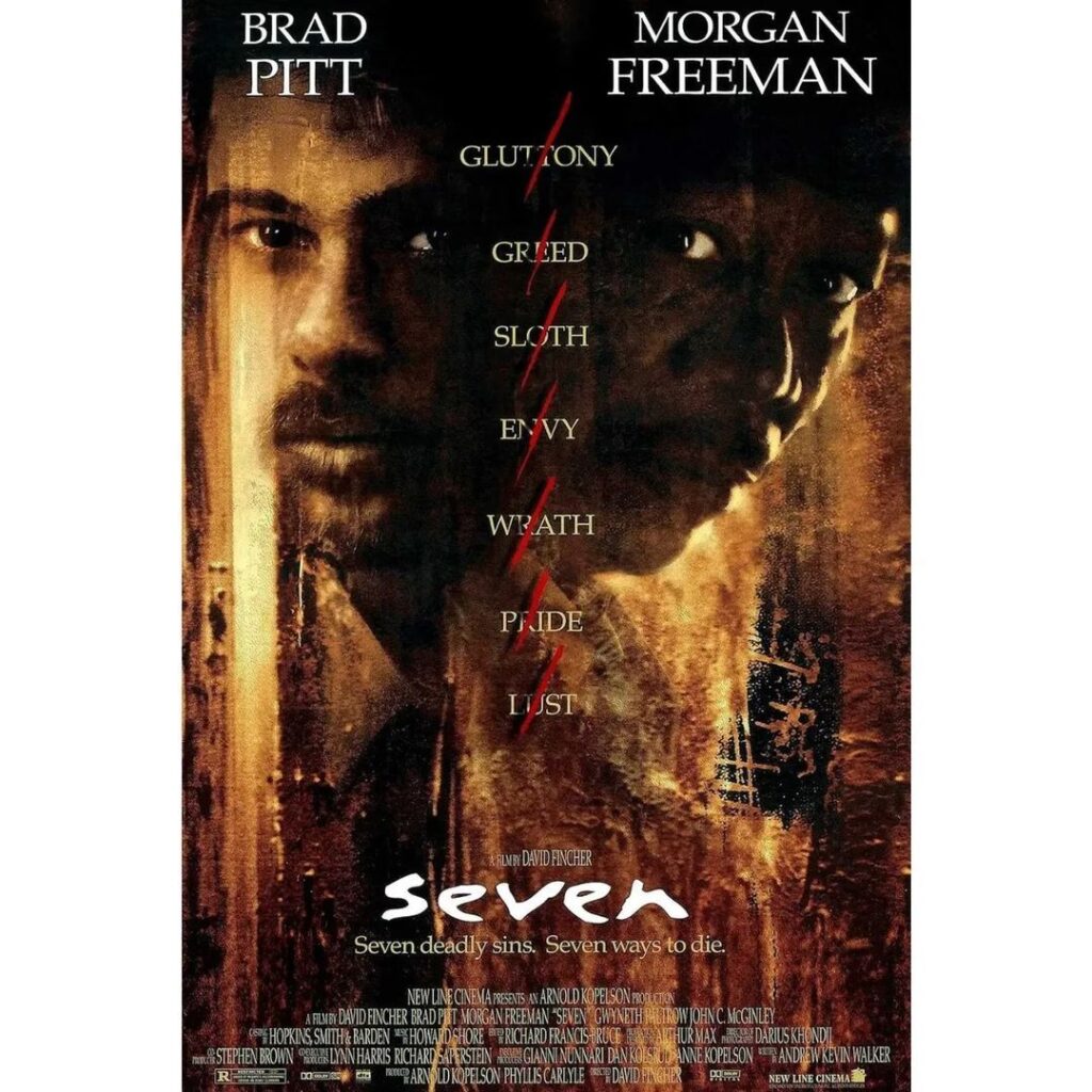 第二部電影是上映於1995年的《火線追緝令》(圖3)也是讓David Fincher成為炙手可熱的導演的開始。Brad Pitt以及Morgan Freeman所飾演的兩位警官,一老一少,兩人的個性相差甚遠。他們要調查以宗教儀式「七宗罪」為動機的連環謀殺案。調查過程中,兩人也逐漸理解對方。最後雖然成功抓到犯人,但結局相當黑暗(不暴雷,自己去看。)甚至當時片商認為這結局太過黑暗,希望能更改結局。好在在主演以及導演的反對下,我們才能看到現在這個結局。