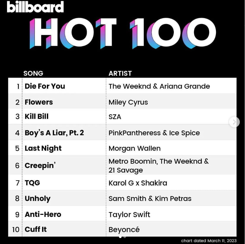 1+1大於2的最好例子,The Weeknd+Ariana Grande。兩人繼上次的Save Your Tears合作後又聯手奪冠,把連續六週冠軍的Flowers擠到第二。(大概只有The Weeknd可以找回Ariana內心的良善,擺脫該死的美妝)