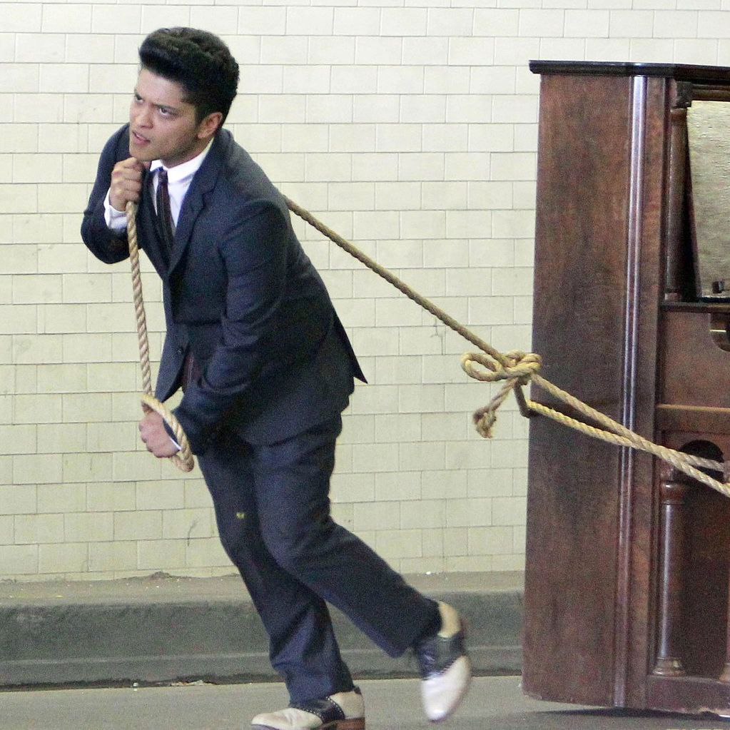 6.Bruno Mars在2010年就已經發行專輯《Doo-Wops & Hooligans》,第二支主打”Grenade”獲得年度第六。在MV中Bruno在前往女友家的路上拖着一架立式鋼琴(圖7)。在女友家門口,他發現女友出軌,於是決定自殺。除了最知名的兩首單曲,此專還有排名26的”The Lazy Song”(我討厭這首歌)。