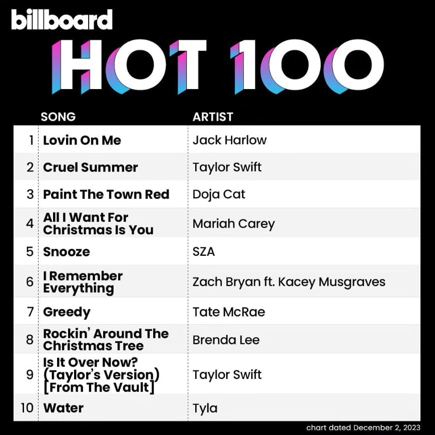 3.Water磨著磨著成為Tyla第一首前十單曲,這首剛聽還好,越聽越洗腦(Make me sweat, make me hotter. Make me lose my breath, make me water💃💃💃)。Tyla為出生在南非的歌手,年僅21歲,今年靠著Water爆紅。今年已經有兩首熱門的Afrobeats單曲(另一首為Rema的Calm Down),明年也許會有越來越多這種風格的單曲出現。