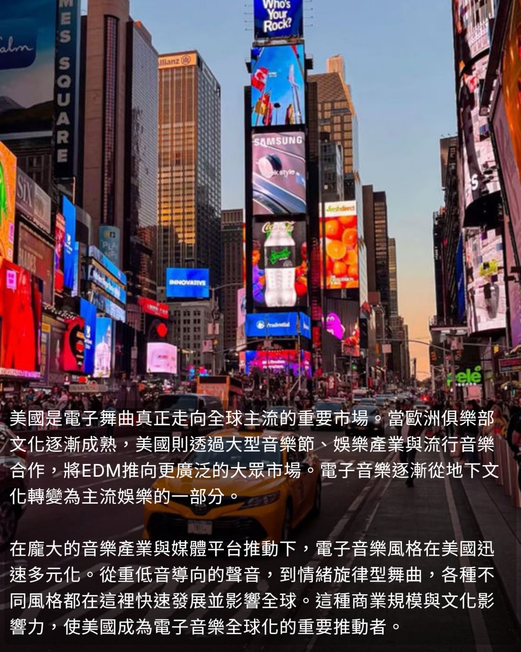 美國是電子音樂商業化與大型化的重要推手。從大型音樂節到主流市場,EDM在這裡被推向全球,也讓更多人接觸到電子音樂文化。不同城市也發展出各自的聲音風格。