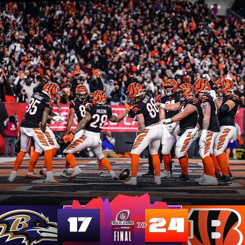 第三場比賽由辛辛那提猛虎對上巴爾的摩烏鴉,主場作戰的猛虎希望能複製去年亞軍的好成績。比賽一直到第四節戰況都非常膠著,兩隊都得到17分。整場的分水嶺發生在第四節烏鴉的一次進攻(圖4),眼看就要達陣得分,沒想到球掉了出來,被猛虎撿到直接回攻得分,這一來一往就差了14分。最後猛虎就靠著這一次達陣,以24比17氣走烏鴉。