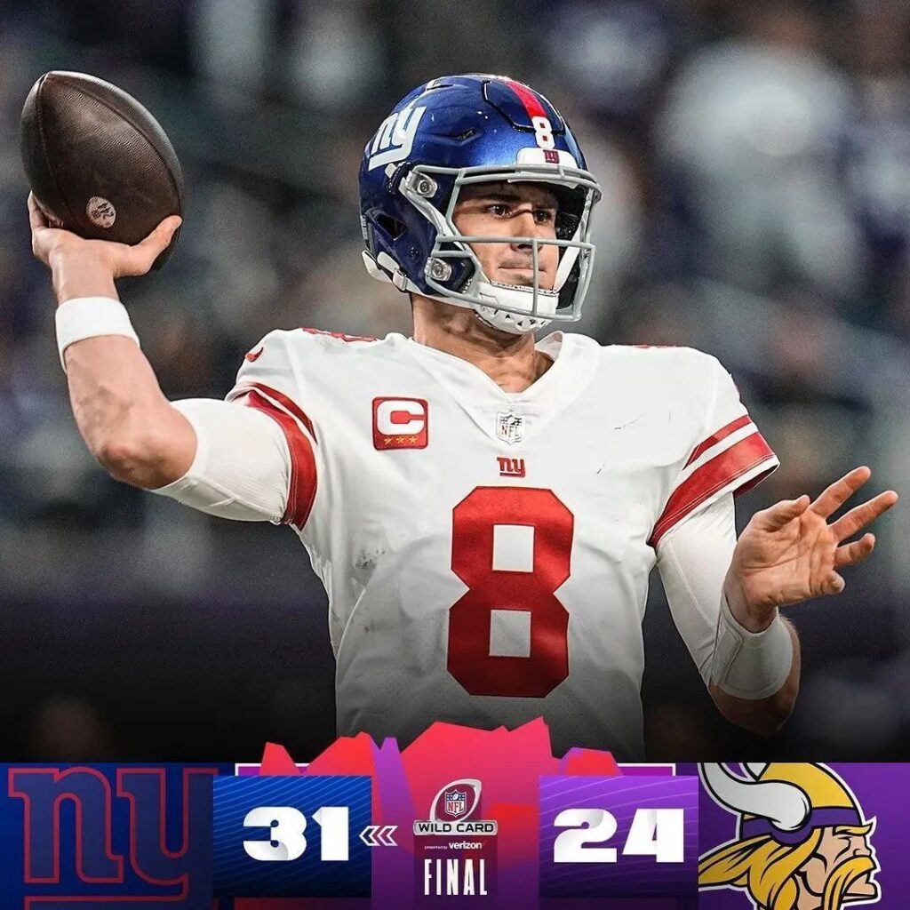 第二場由明尼蘇達維京人對上紐約巨人。巨人本場四分衛Daniel Jones發揮相當出色,35次傳球24次成功,總共傳出301碼兩次達陣,絕對是本場MVP。巨人雖然例行賽勝率不如維京人,還是以下剋上擊敗了強敵。巨人上次季後賽勝利已經要追溯到2011年球季,那年超級盃在Eli Manning的帶領下擊敗有Tom Brady的新英格蘭愛國者拿到總冠軍。