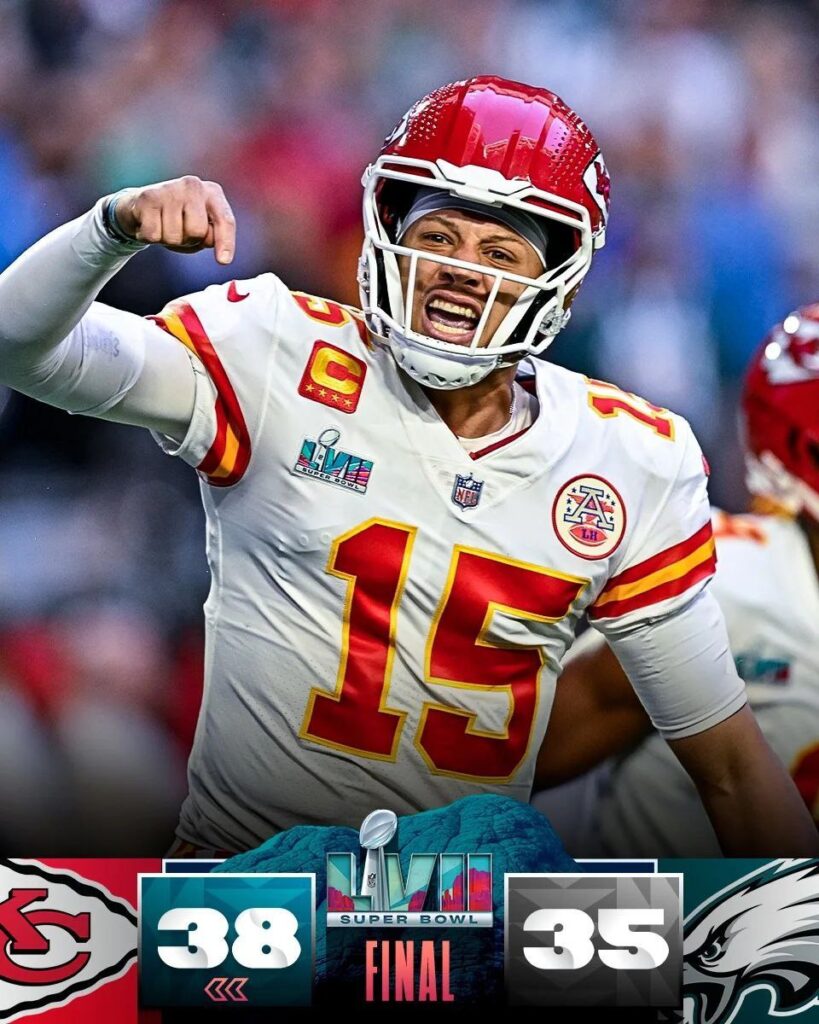 半場回來之後,酋長隊隊醫不知道是對Mahomes做了什麼治療,突然又恢復成我們印象中的那個Mahomes,能傳也能自己跑。連續的三個達陣使酋長再又要回領先,不過老鷹還是頑強的追平比分,暫時以35比35分平手。比賽最關鍵的轉折出現在第四節剩下1分54秒的時候,酋長隊此時第三檔還要進攻八碼,裁判判罰老鷹隊防守球員Holding,導致讓酋長隊推進十五碼,能夠重新進攻。酋長隊再把時間拖到剩下11秒後,靠著Butker的踢球得分(圖3),最後就以38比35,3分之差氣走老鷹,成功奪得冠軍。Patrick Mahomes也成為1999年後下一個能拿年度MVP,並且帶領球隊奪冠的球員,同時他也收穫個人第二座超級盃MVP(圖4)。Mahomes才年僅27歲就已經達到這麼多成就,或許有機會挑戰Tom Brady的地位。