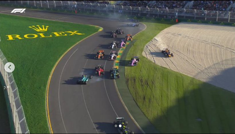 開賽沒多久Leclerc就被擠出去,三場裡面就有兩場未完賽。後面因為Albon的撞牆以及Russell車起火為這場大混戰起頭。最drama的一次事故發生在第54圈(比賽總共58圈),Magnessun上牆,出了紅旗,大家必須回pit重新起跑。重新起跑之後,幾輛車又撞成一團(圖2),剛出來又再出紅旗。最後,因為Sainz被加罰5秒,使得Alonso連三場上頒獎台。