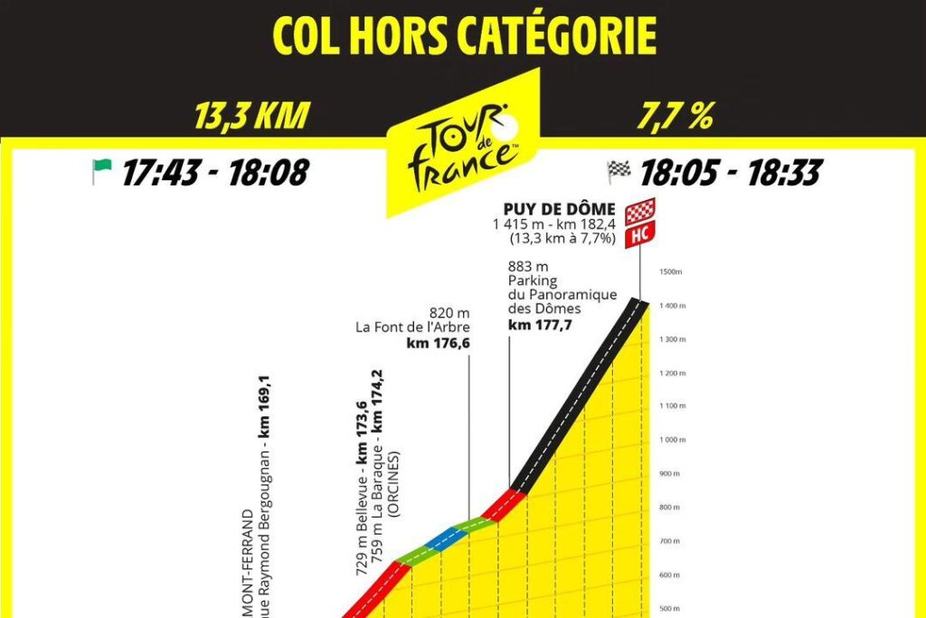 這一站環法回到自1988年後就沒有來過的Puy de Dôme(圖2)(多姆山),車手們必須要在13.3km爬升1415m(圖3)。光是看直播就頭皮發麻的陡,車手必須在單站最後燃燒小宇宙才能抵達終點。