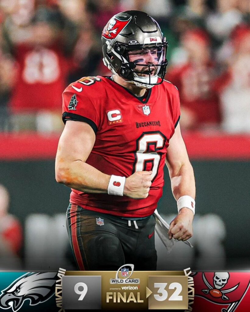 第二場比賽是費城老鷹隊作客坦帕灣海盜隊(圖3)。老鷹隊在賽前就已傳出球隊「怪聲」頻傳,內部矛盾不少,而這似乎也反應在今天的比賽中。老鷹在這場的發揮只能用「荒腔走板」來形容,防守各種漏人,進攻也只有DeVonta Smith有表現。雖說海盜隊是因為在比較弱的分區才能進入季後賽,不過四分衛Baker Mayfield在這場的表現極佳,整場傳出337碼、3次達陣。Mayfield在第四節中有一球「後仰跳投」傳給端區的Chris Goodwin(圖4),如果下一場對戰雄獅隊也能打出這種配合的話,或許真的能晉級到分區冠軍戰。海盜隊防守端則使用大量的Blitz來對付老鷹四分衛Jalen Hurts,這招非常有效,整場Hurts受到了13次的快速壓迫,是他生涯出賽場數中單場最多的一次。Hurts沒辦法有效站出來(當然也不能全怪他),老鷹整場只得了9分。這也許是老鷹陣中幾名老將像是Jason Kelce、Brandon Graham的最後一場比賽,以這種方式結束確實讓人難過。