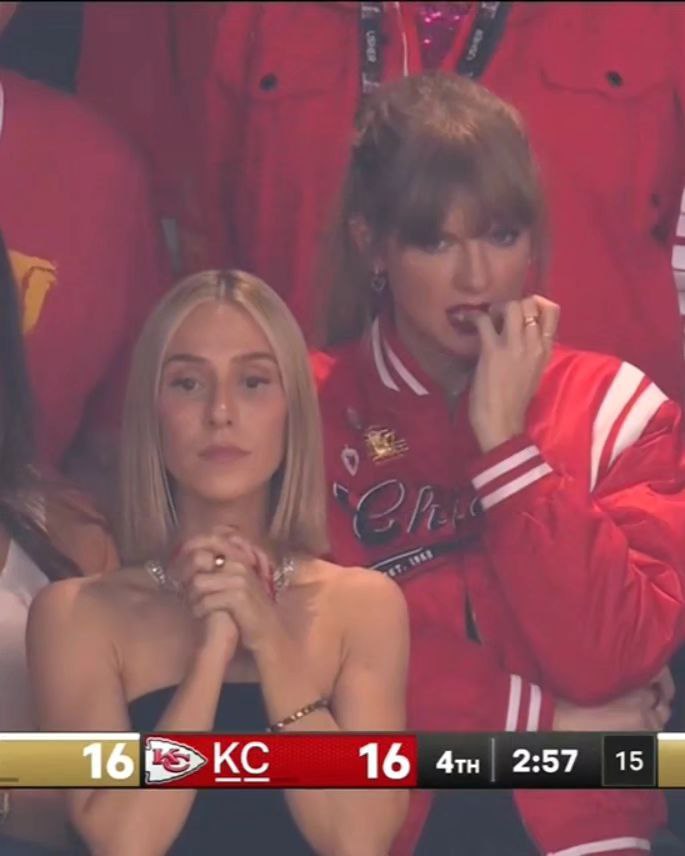 除了球員本身,場邊大咖也是超級盃看點之一,今年最受到關注的自然是Taylor Swift。剛在日本開完演唱會的她特地馬上飛回來支持男友。她在場邊整場看起來都很緊張,還緊張到吃手手(圖7),還好最後讓她等到了勝利。賽後小倆口也在場邊放閃,不過賽前傳的「奪冠後求婚」並沒有發生。