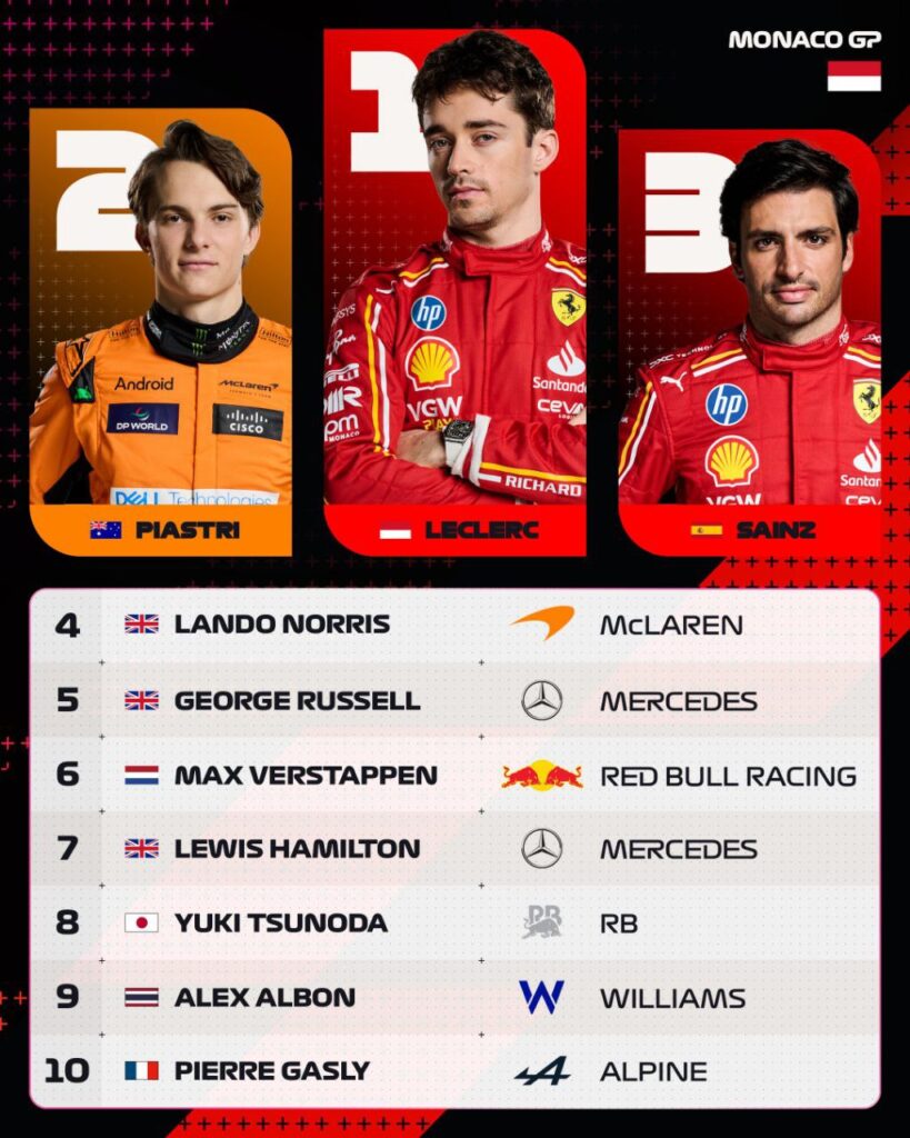 除了Ferrari外,本場另一大贏家是P2以及P4完賽的McLaren。第二的Piastri整場都咬著Leclerc,但就是找不到機會超車,不過這麼年輕就在摩納哥站上頒獎台,表現非常突出。