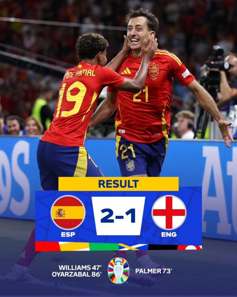 決賽兩隊上半場以0:0握手言和,節奏流暢,比起前幾場是精采不少。下半場剛開始47分鐘就靠著Yamal與Nico Williams的連線,率先破門。英格蘭在70分鐘換上「切爾西太子」Cole Palmer,剛上來3分鐘他就馬上建功,將比分扳平,又救了教練Gareth Southgate一命。正當以為英格蘭又要將比賽帶進延長賽時,效力於皇家社會的Mikel Merino在86分鐘的進球殺死了比賽,最終西班牙就以2:1擊敗英格蘭。