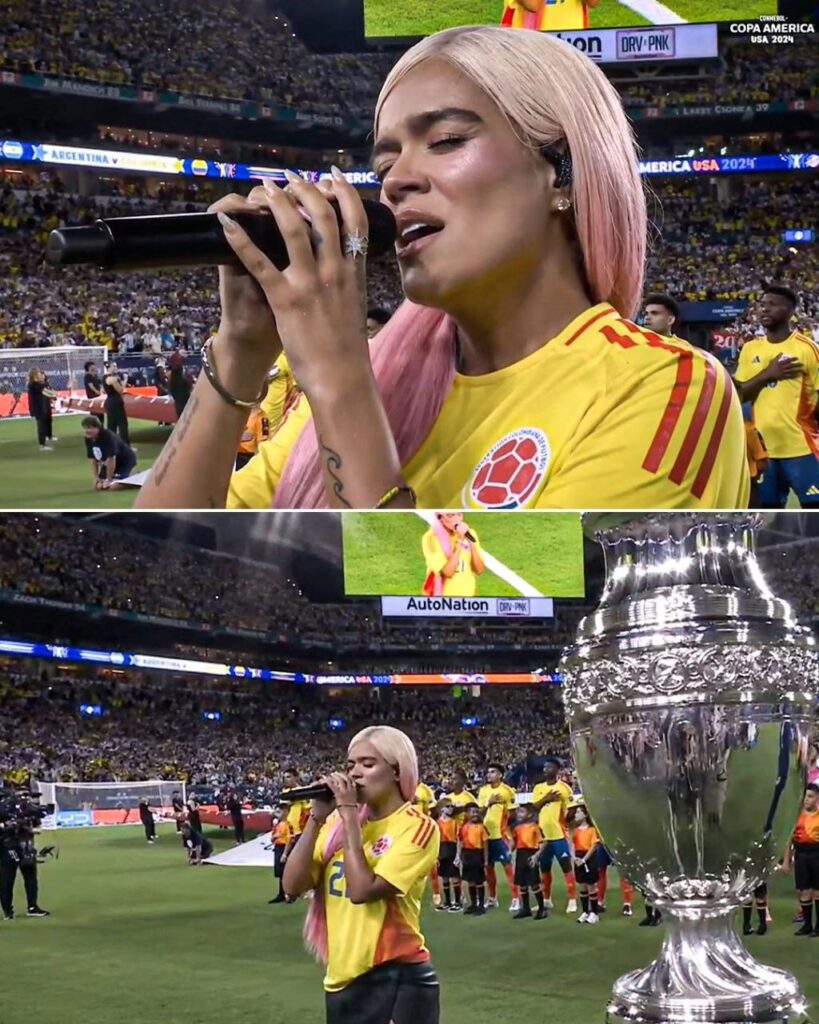 決賽前的國歌演唱哥倫比亞找來了Karol G(圖2),阿根廷這邊找來了Abel Pintos,算是各自替兩國助威。中場表演請來了哥倫比亞女歌手Shakira(圖3),剛好她在2020年登上超級盃中場秀也是在這座球場,因此中場休息時間從15分鐘延長到了25分鐘,這是美洲盃第一次有中場表演(當超級盃在辦欸,這很美國),Shakira一共表演了四首單曲Hips Don’t Lie, Te Felicito, TQG, Punteria。