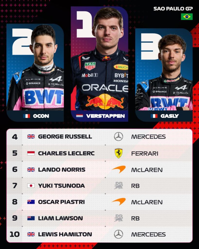 上次頒獎台上有兩個法國車手已經是1997年,再加上Alpine今年的表現非常低迷,這場一口氣大進補,讓他們在車隊排名上升到第6的位置。從P17出發的Verstappen最終拿下勝利更是不可思議,他已經連續十站未能拿下勝利,也難得在衝線後激情吶喊。在歷史上只有5位車手能從P17(或更後)能獲得單站勝利。以P3出發的Tsunoda相當可惜,若沒有受到賽會干預或許有機會登上頒獎台。