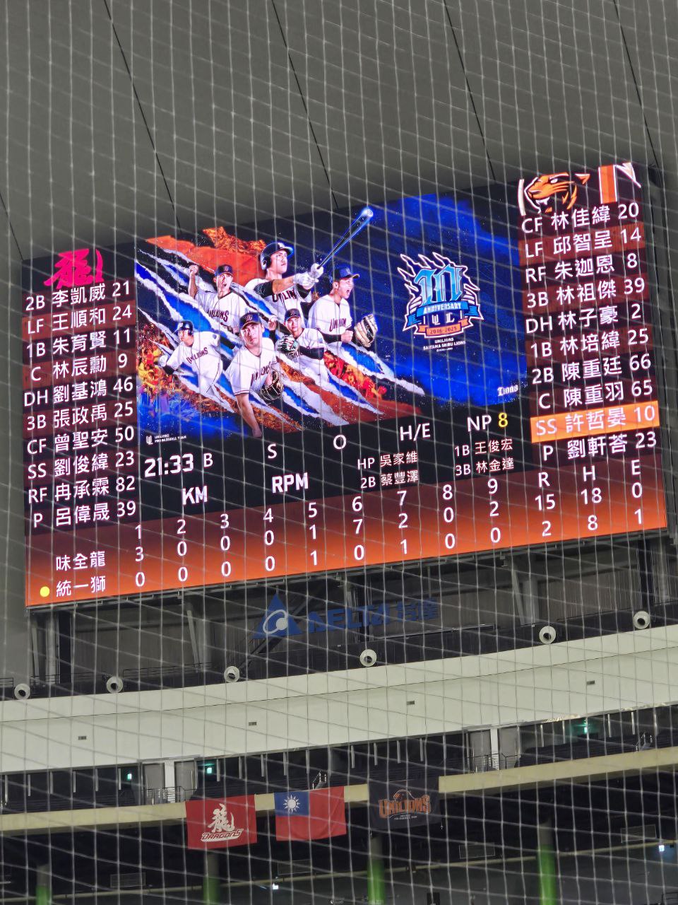 統一獅新球季第一場在台北大巨蛋的主場比賽,結果面子裡子都輸。一局上就先被味全龍隊得了3分,6局上半在先發投手布雷克下場後換上中繼投手群,結果單局被得了7分包含吉力吉撈•鞏冠的一支兩分砲,直接把獅隊打崩,後續龍隊仍有分數進帳。最終味全龍15比2輕鬆打敗獅隊,為大巨蛋三連戰開了好彩頭。