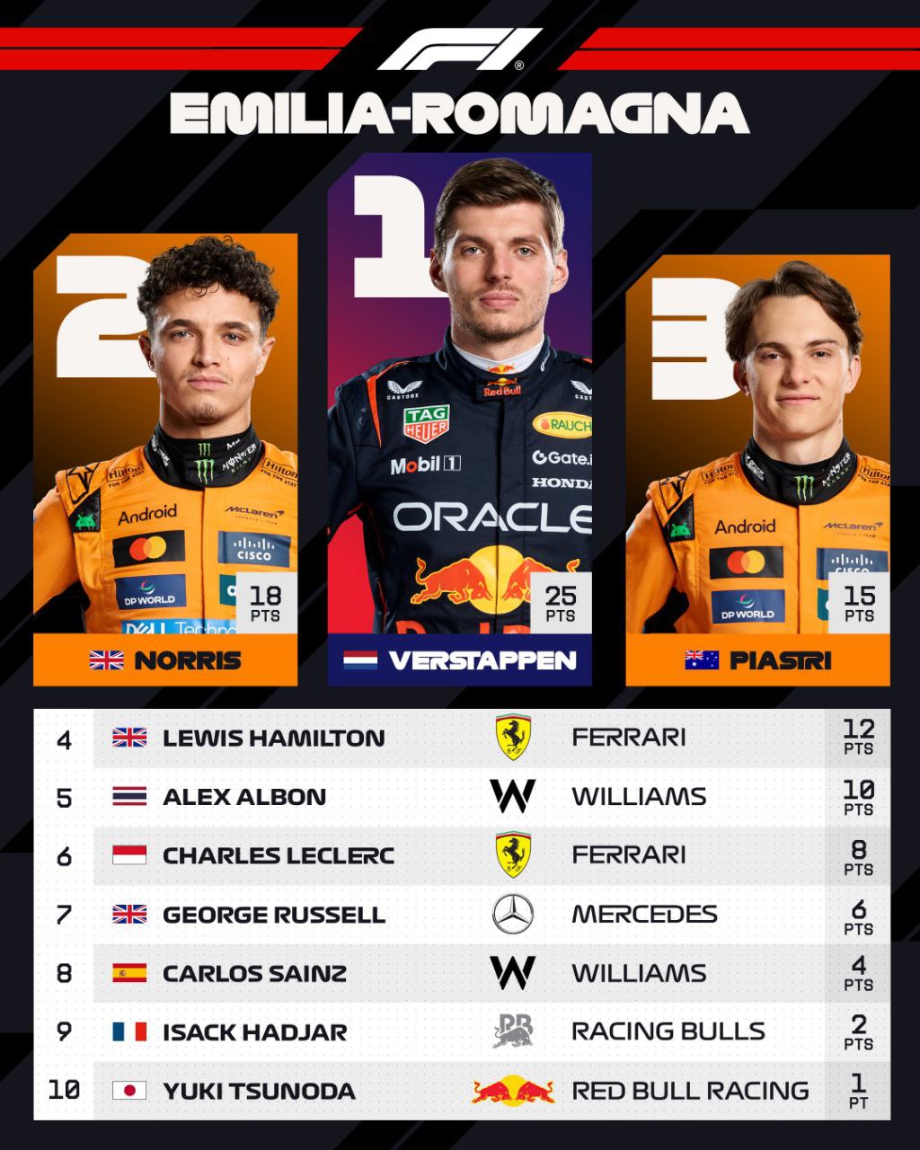最終Verstappen在Red Bull隊史第400場大賽以勝利作結,隊友Tsunoda維修區起跑,最終在積分區末尾完賽。McLaren雙人上頒獎台,持續領跑車手積分榜。雖說Leclerc最終沒守住Albon,但兩台Ferrari仍以P4與P6完賽,以排位賽結果來看已經是很不錯的結果了。Albon連續兩場拿下P5,Aston Martin雖說雙雙進入Q3,但正賽卻一分未得,相當可惜。
