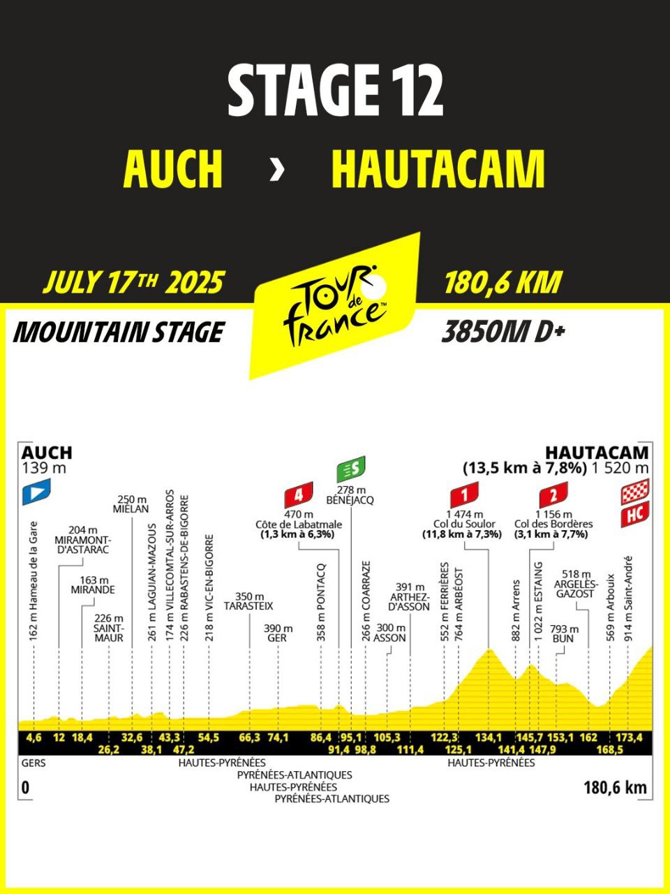 第12站進入本屆首場真正的高山賽段,終點設在庇里牛斯山脈的著名爬坡Hautacam。比賽一開始就節奏猛烈,總共有 52 名選手組成大型突圍集團,當中不乏具GC威脅的 Carlos Rodriguez與爭奪圓點衫的Lenny Martinez等名將,但領先優勢從未超過2分20秒。Visma-Lease a Bike、UAE Team Emirates-XRG等隊伍聯手控制戰局,最終於Col du Soulor爬坡時開始瓦解突圍集團。