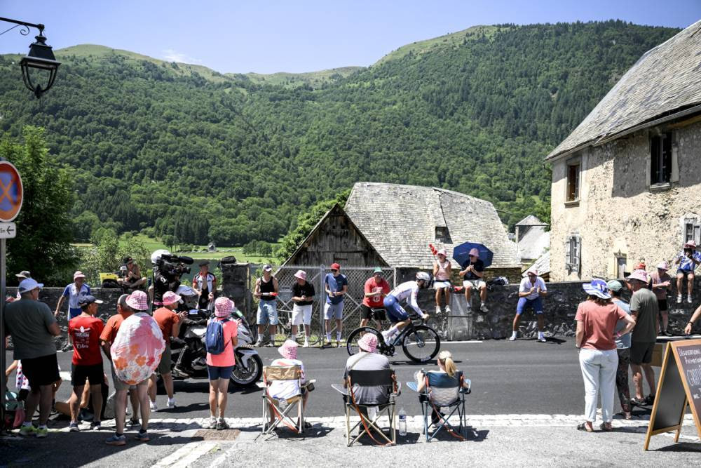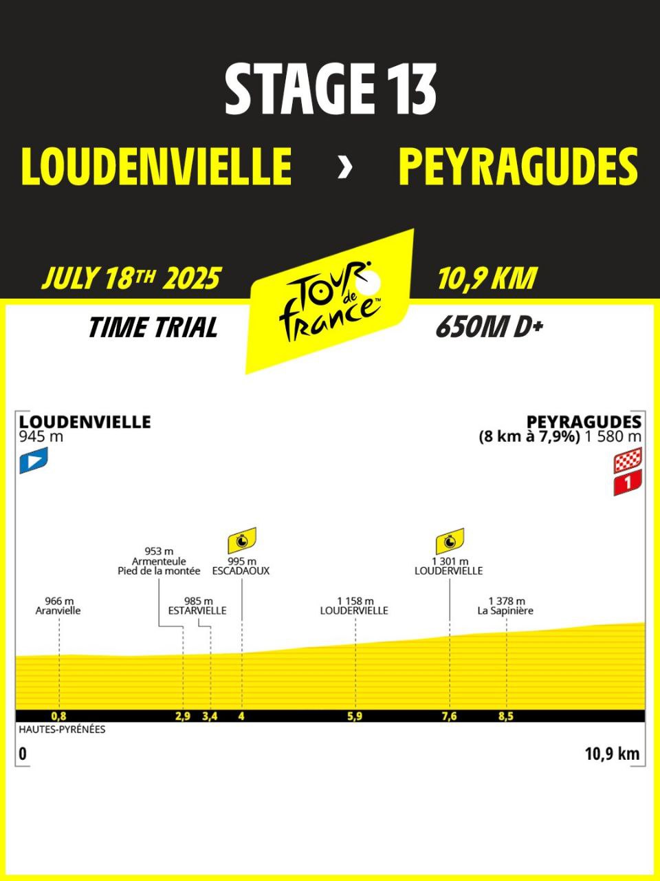在繼第12站稱霸Hautacam後,Tadej Pogačar在第13站再度展現壓倒性實力,在熟悉的Peyragudes滑雪場贏得這場艱難的爬坡計時賽。他早在2022年就曾在此奪勝,如今再度拿下勝利,將他在環法的總計賽段勝場數提升至21場。他今日以23分整的成績完成賽段,平均時速達到28.4公里。賽段第二的Jonas Vingegaard落後36秒、第三的Primož Roglič落後1分58秒,Tadej Pogačar大幅鞏固黃衫優勢,總成績領先Jonas Vingegaard來達4分07秒,冠軍寶座越來越穩。