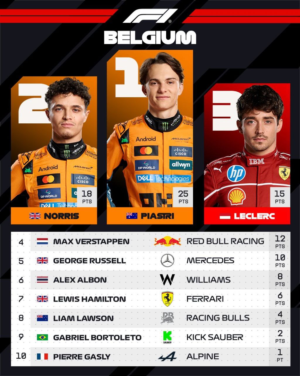 在大部分車手都選擇一停的情況下,比賽在後半段並沒有太多變化。Norris雖然一度有機會趕上自己的隊友,但在幾次失誤的情況下最終仍然只能看著隊友奪下單站冠軍。Leclerc也是頂住後方Verstappen的追擊,成功搶下頒獎台最後一個席次。Piastri在這站奪冠後生涯冠軍數來到8次,追平Norris與Leclerc。Hamilton多次嘗試超越以P6完賽的Albon,但最後還是只能以P7作收,不過以他的發車順序來說相信他應該對這個結果還算滿意。
