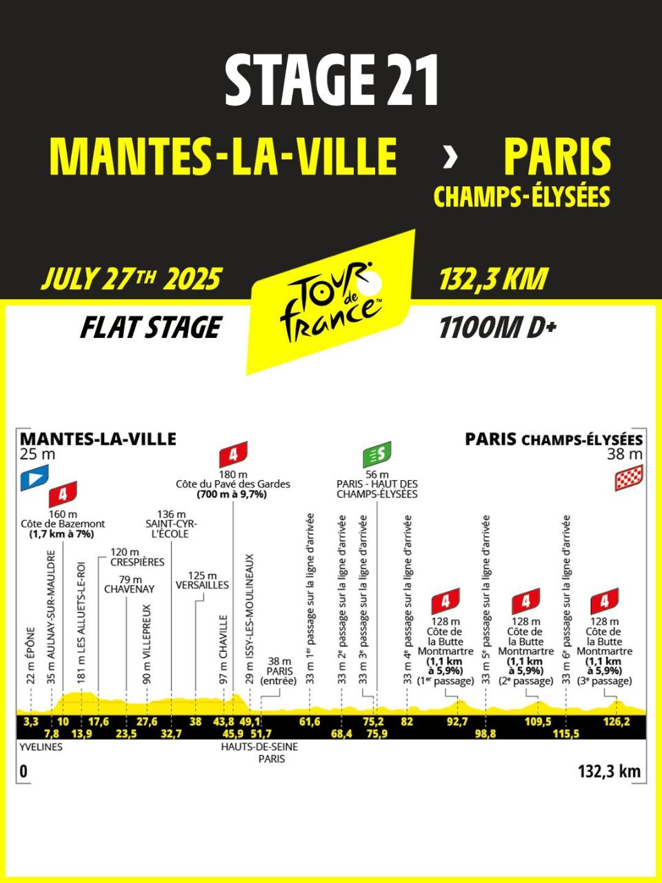 去年因為巴黎奧運的緣故,環法的終點從熟悉的巴黎香榭麗舍大道移至尼斯。而今年賽事終於重返這條象徵性的終點大道,恰逢香榭麗舍大道成為環法終點的第50週年,別具意義。除此之外,今年最終站也改版,今年在結束前需要三度翻越Côte de la Butte Montmartre,復刻了巴黎奧運的經典戰役,打破過往最終站平路衝刺的慣例。然而因為下雨的緣故,導致石板路溼滑,官方為了安全起見,在剩下約50公里時宣布凍結總成績。
