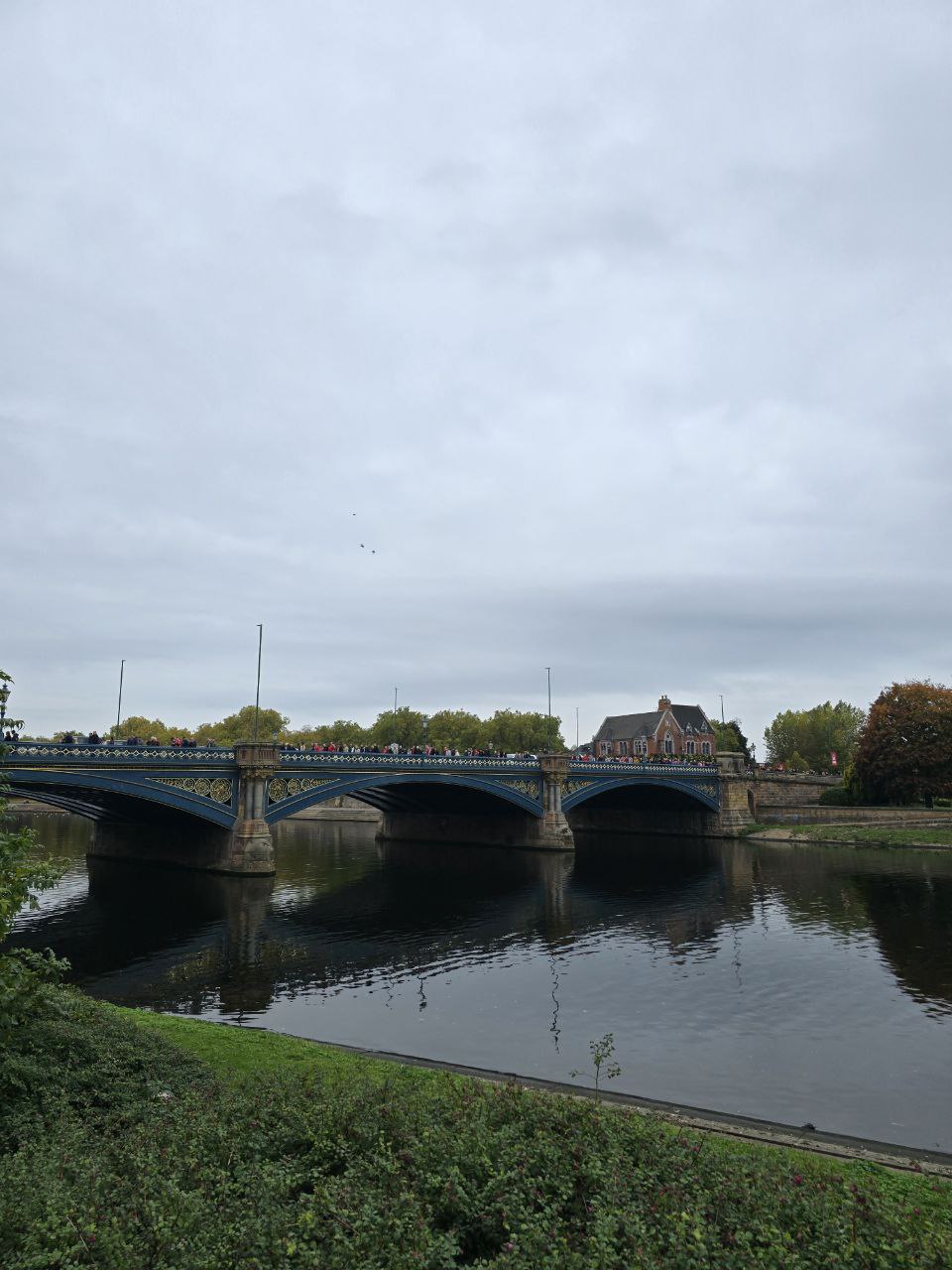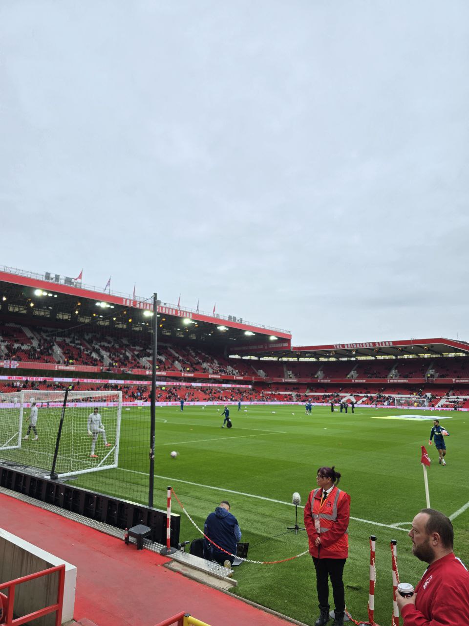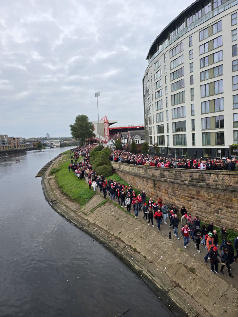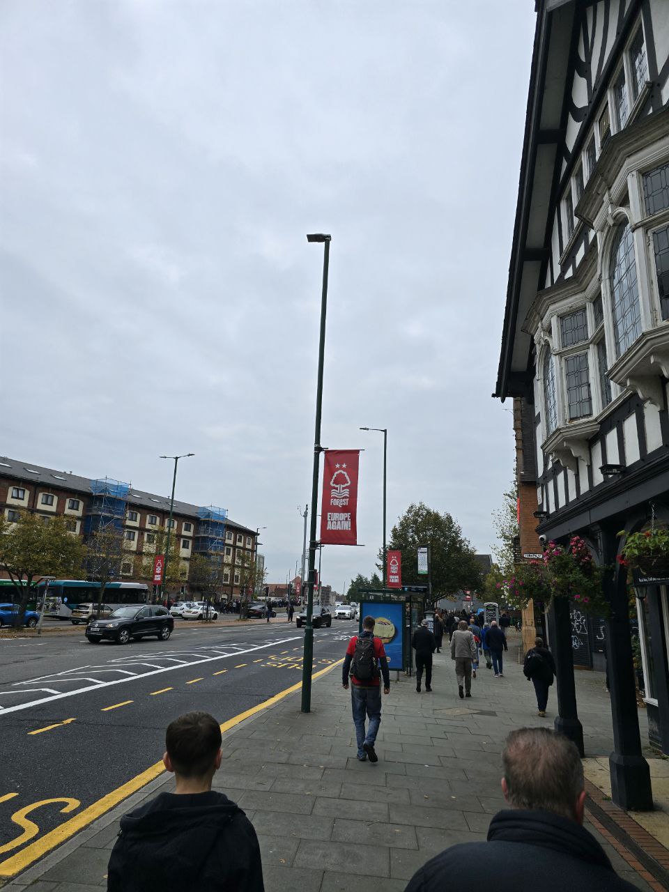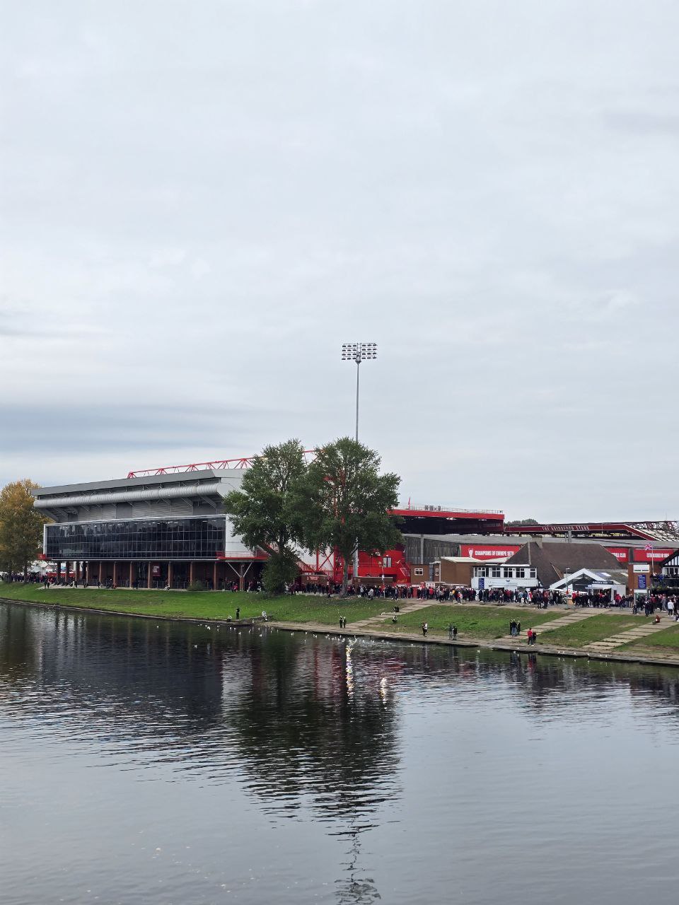 比賽日當天,球場周遭會實施交通管制,因此大部分的球迷會選擇從市中心走大概20分鐘前往球場。我也是從我家先搭輕軌到諾丁漢火車站,再跟著球迷們一起往球場前進。因為球場在河邊,所以會比市區還冷,除了球衣、帽子外也可以看到很多球迷戴著森林的毛帽或是圍巾。在我去過這麼多球場中,City Ground的景色真的是數一數二美的,在Trent Bridge上就可以眺望球場。