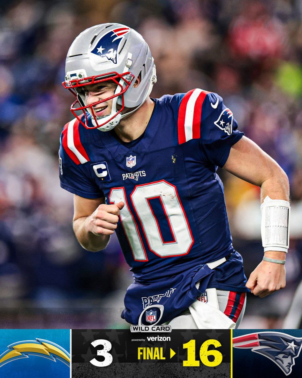 第三場由新秀四分衛Drake Maye帶領的新英格蘭愛國者主場作戰洛杉磯電光,靠著全場強悍的防守與關鍵進攻,愛國者以16比3擊敗對手。愛國者開賽先以射門取得3比0領先,電光隨後同樣靠射門追成3比3,但這也是他們全場唯一的得分。進入下半場後,愛國者持續在場面上施壓,第三節兩度踢進射門,將比分逐步拉開至9比3,成功掌控比賽節奏。第四節關鍵時刻,四分衛Maye終於傳出致命一擊,傳出28碼達陣給Hunter Henry,替比賽定調。防守端成為愛國者贏球的最大基石,他們全場送出多次擒殺並徹底封鎖電光進攻,使四分衛Justin Herbert始終處於高壓狀態,無法帶領球隊反撲。最終,愛國者靠著穩健執行力與防守強度晉級下一輪,而電光則在進攻受限的情況下結束本季旅程。