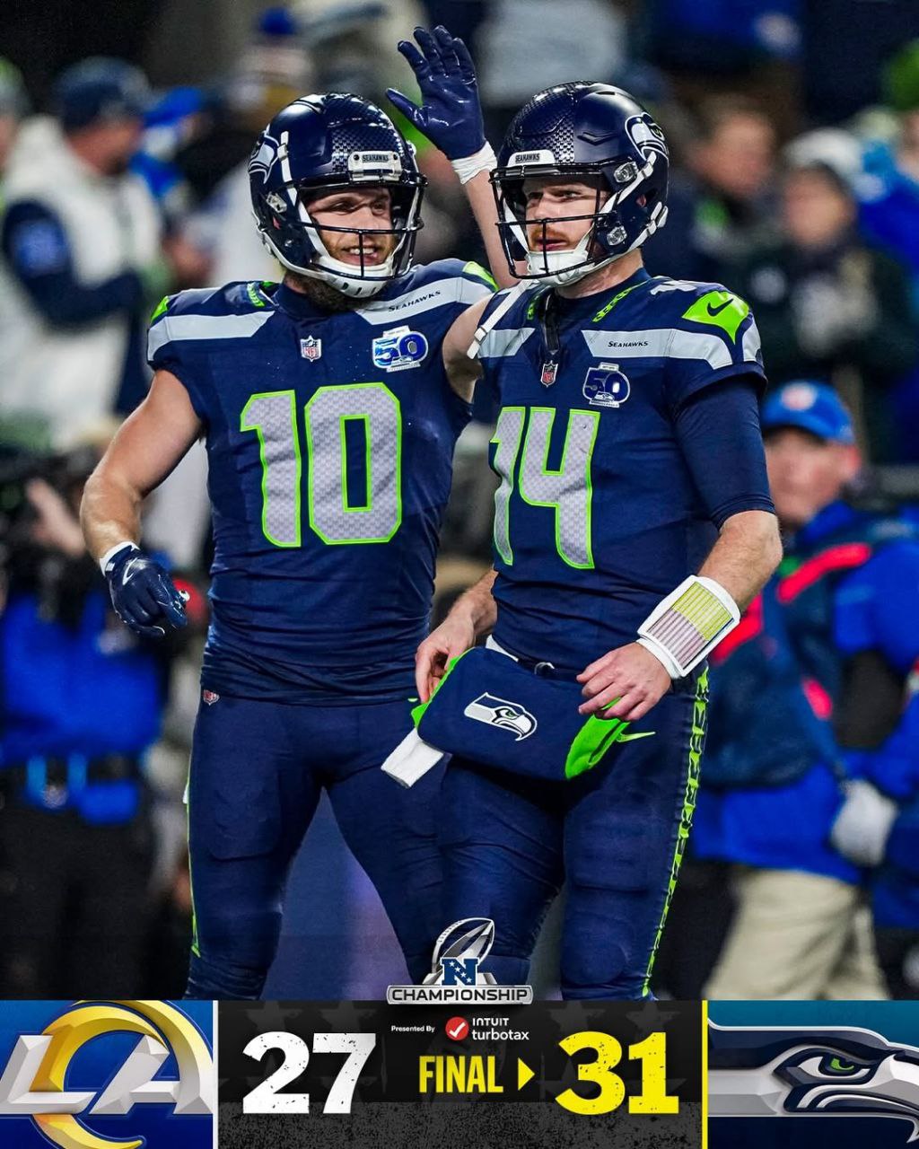比賽從一開始就像季後賽等級的硬仗,海鷹憑著地面與短中傳的穩定攻勢先在首節取得領先,隨後再用持續進攻推進製造分數,不讓對手有太多喘息空間。公羊在第二節找回節奏靠射門追分,並於上半場末段靠Matthew Stafford與Kyren Williams的配合達陣將比分反超,不過海鷹沒讓這個勢頭延續太久,他們在下半場展現出全方位進攻火力,由四分衛Sam Darnold主導牌面,不僅完成多次關鍵傳球推進並投出三次達陣,還彌補了先前失誤帶來的場面被動,使球隊重新掌控比賽走向。比賽進入第四節後,雙方來回得分、互有攻守,直到尾聲仍是1個球權的差距;公羊在最後一次進攻推進中也一度接近反超,但在關鍵紅區防守上海鷹守住了對手,最終海鷹以31比27驚險贏下這場西區宿敵大戰,挺進超級盃。