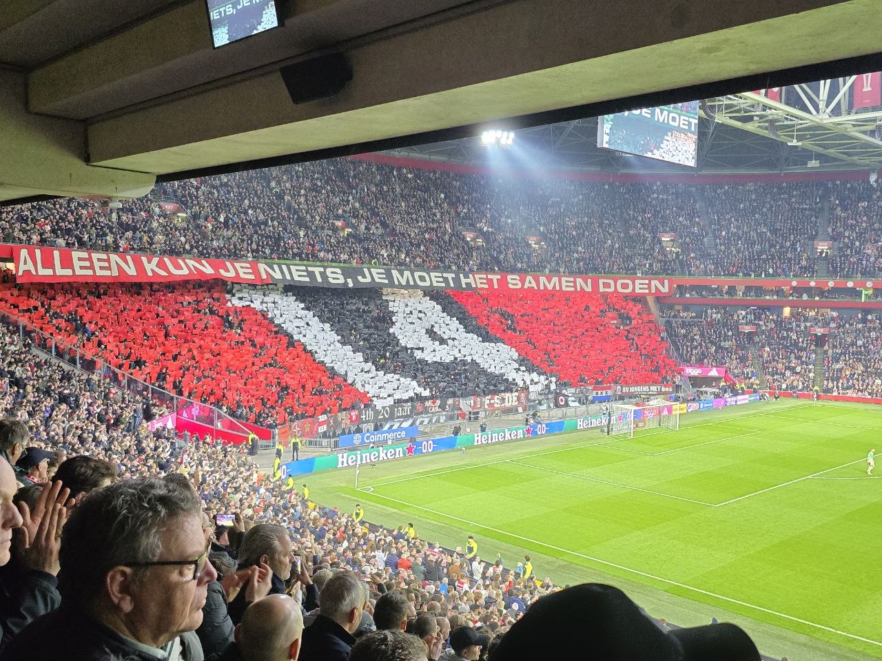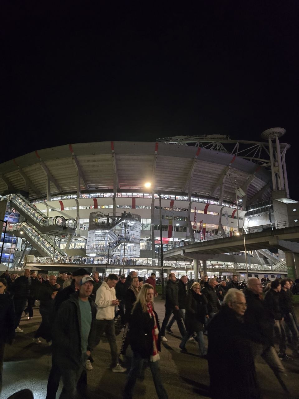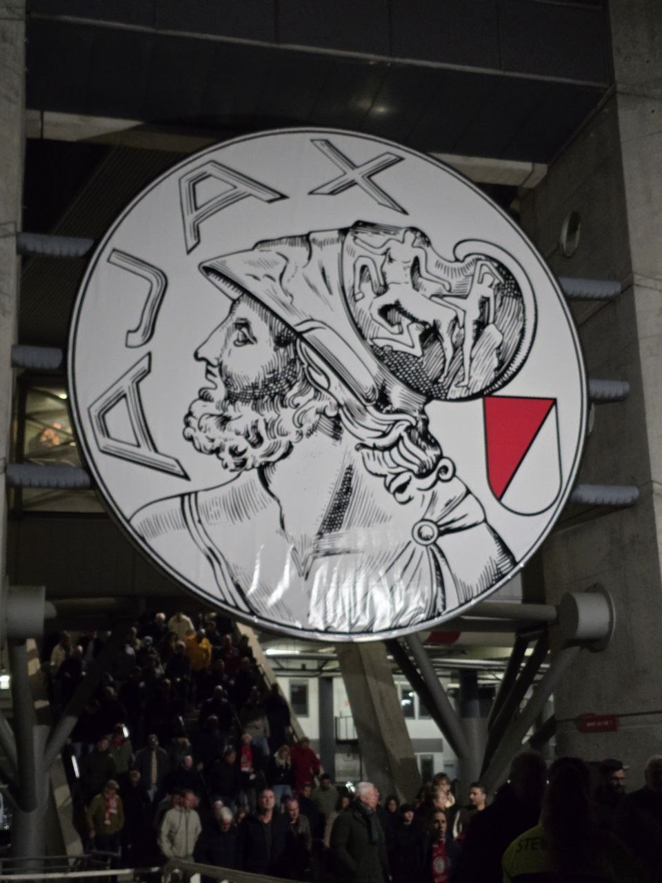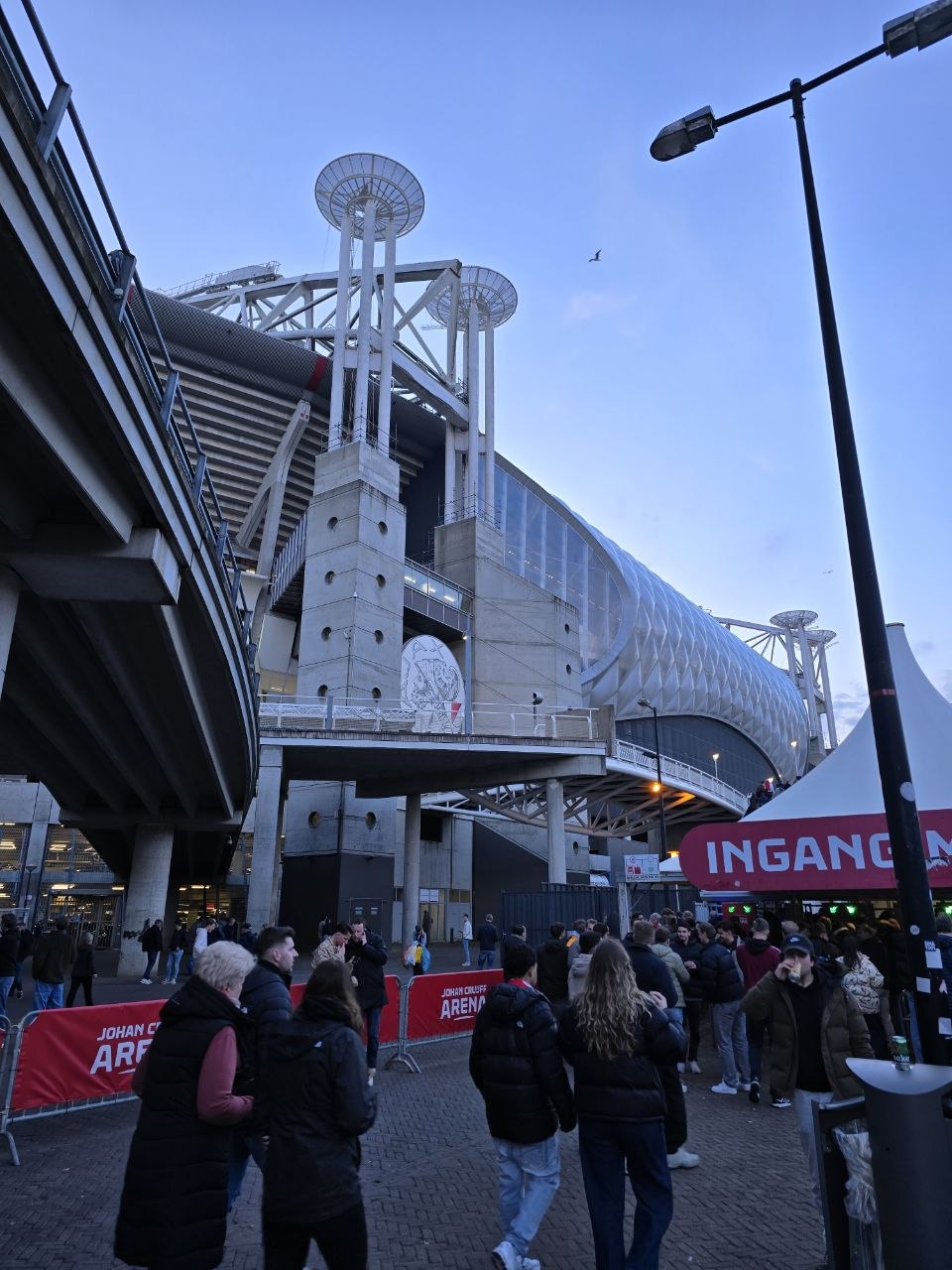 當天比賽是晚上九點才開踢,我沒有太早進場,而是在球場外圍晃了一陣子。外面其實就已經很有比賽日的氛圍,人潮慢慢聚集,大家穿著球衣、圍巾,商店區也相當熱鬧。作為荷蘭最大球隊之一,阿賈克斯的財力其實很直接地反映在球場上,整體設施新穎又氣派,裡面的販賣部、商品區也非常完整。