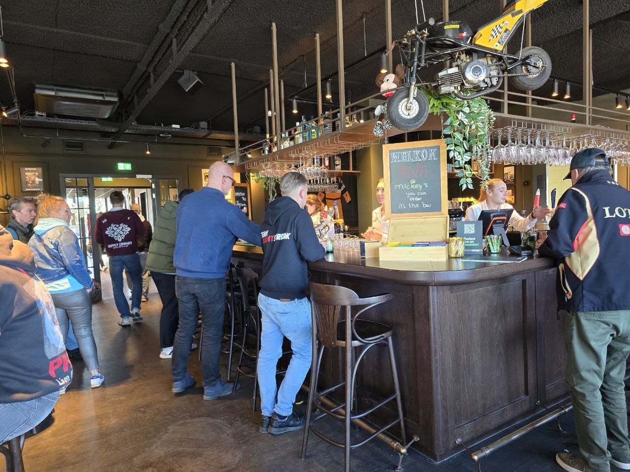 我去的那一天剛好遇到當地賽車組織舉辦活動,現場其實比想像中熱鬧不少,可以看到觀眾坐在看台上,或是站在賽道中間建築的頂樓,近距離看著車輛一台台呼嘯而過。繞完賽道一圈後,我走到賽道內的Micky’s Bar稍微休息一下,這間酒吧裡面擺放了一些F1相關裝飾,雖然不大,但氛圍蠻到位的。