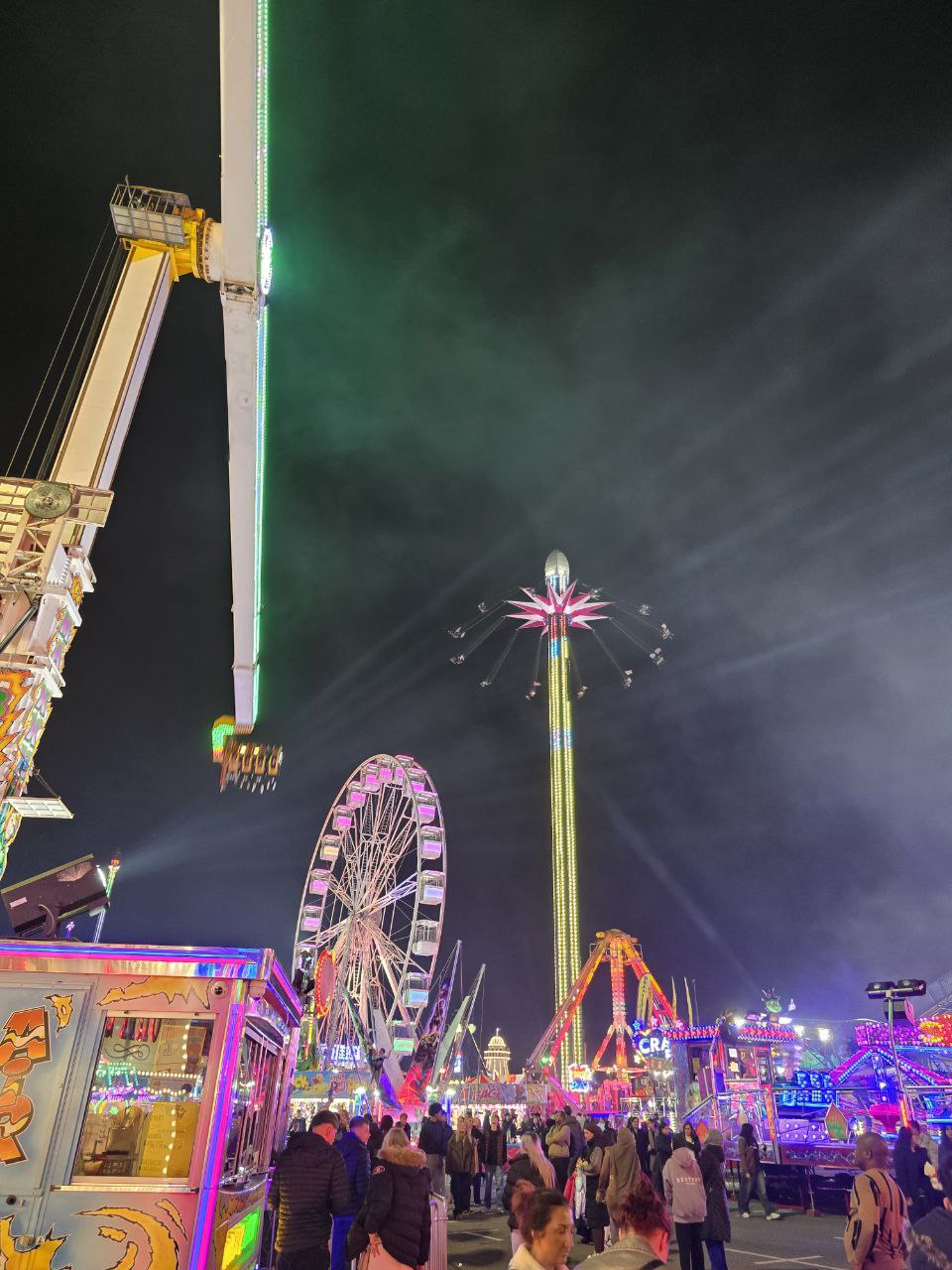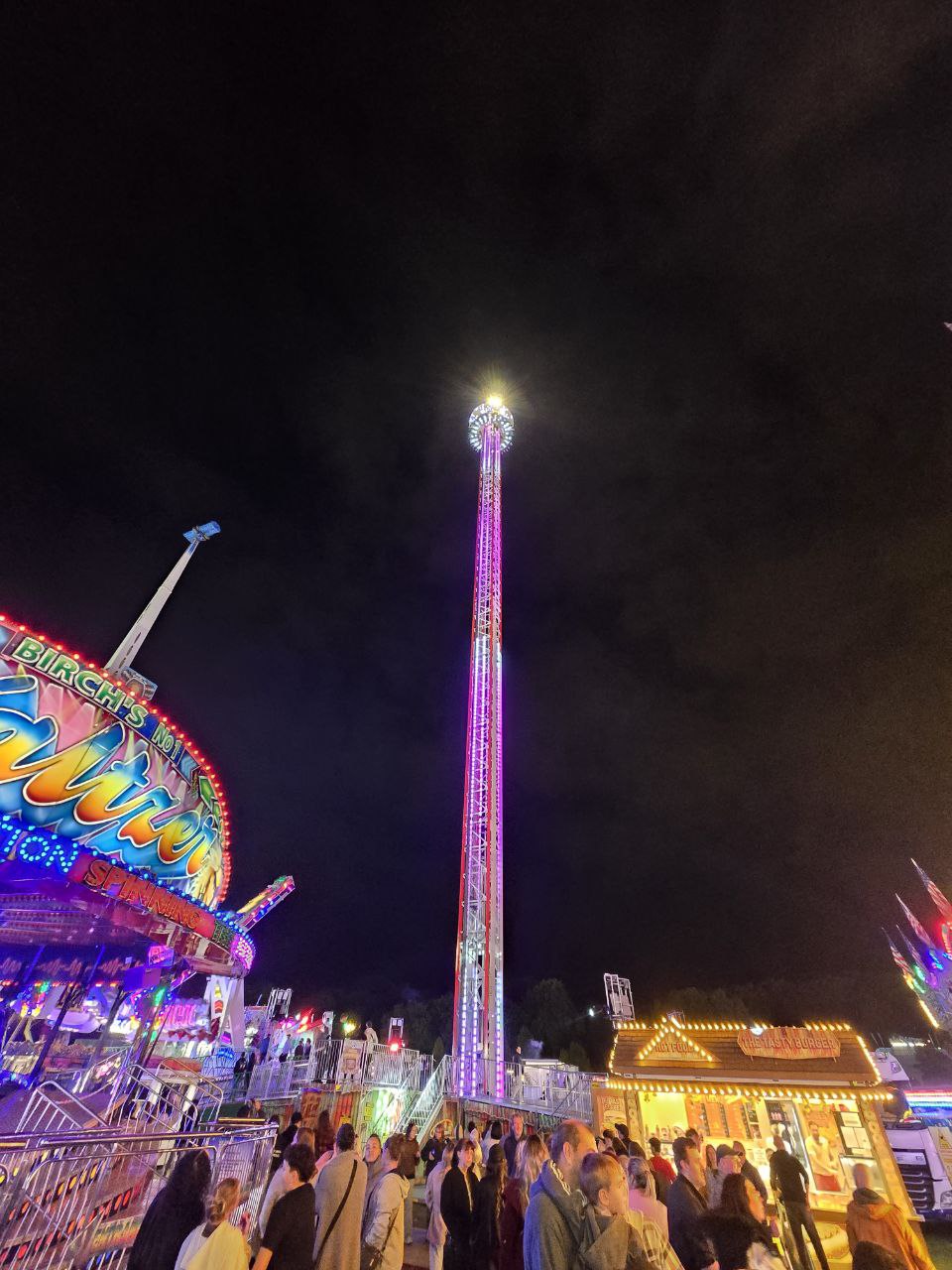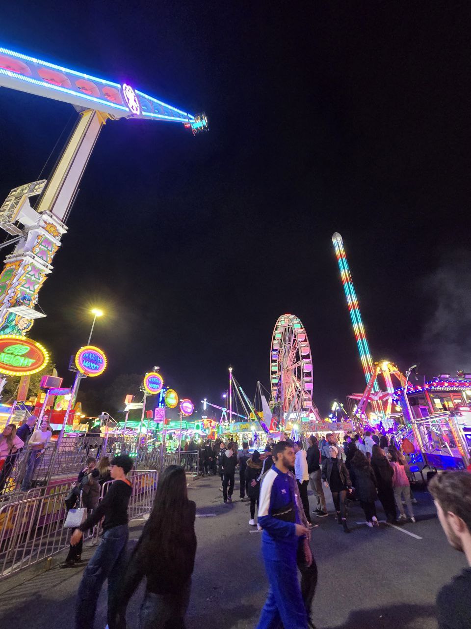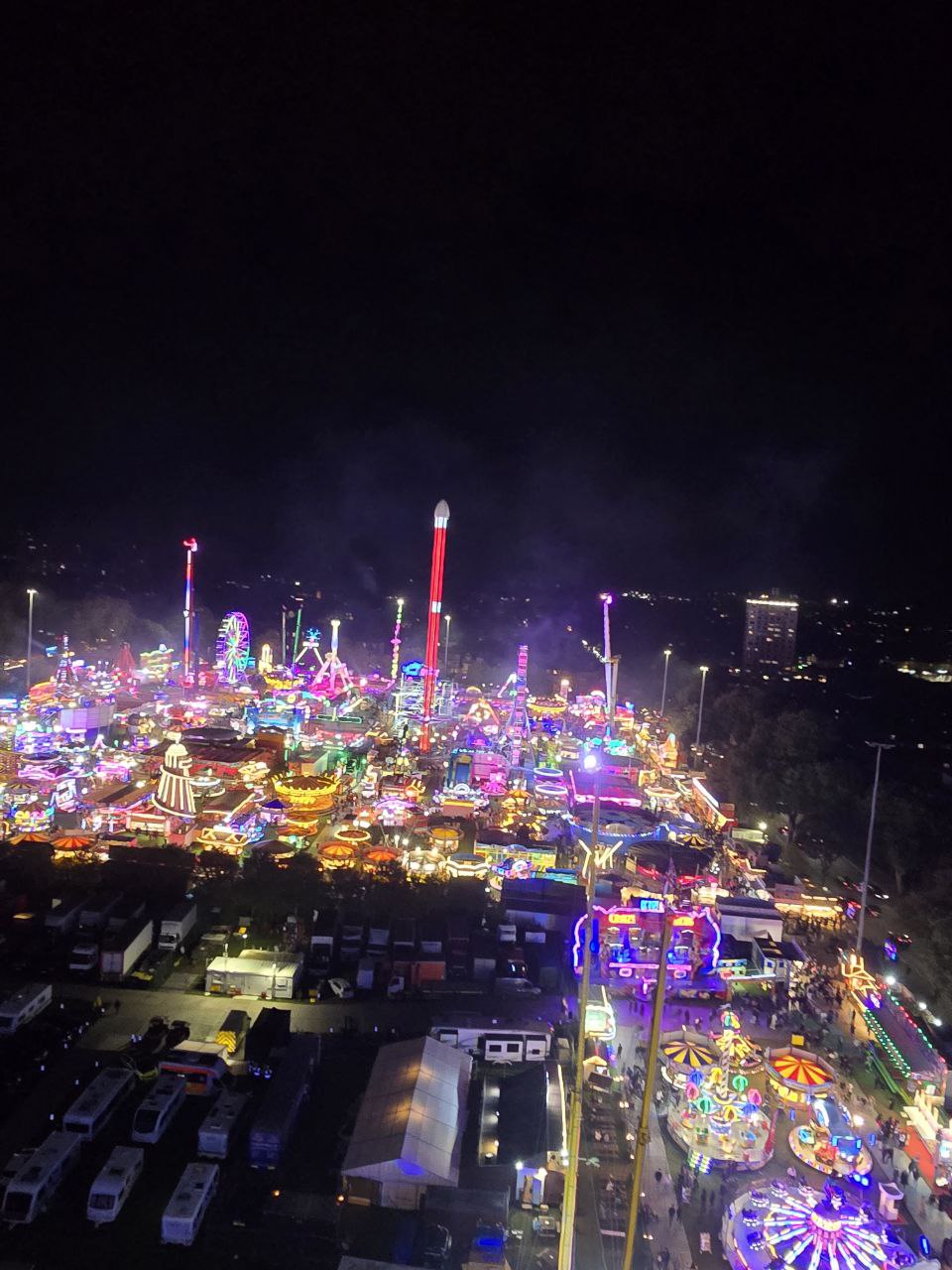 我第一天開放就去參觀,現場充滿了各式各樣的人群。有全家大小一起出遊的家庭、也有成群結隊的學生,還有不少年長的居民,特地來懷念這個對他們來說充滿回憶的年度活動。進去Goose Fair是不需要門票的,當你要玩遊樂設施才需要付費。適合小朋友的設施比較便宜,約在4鎊左右;比較刺激的設施則在6至10鎊左右。畢竟都是臨時搭建的,市集內沒有大型雲霄飛車,這也使得設施同質性有點高,大部分都是旋轉翻轉類或是擺盪旋轉類,我自己是玩了大概7樣設施。眾多遊樂設施中,比較特別的是自由落體(圖6),它是世界上最高的可移動自由落體,有80公尺高,坐上去可以俯瞰整個充滿霓虹燈以及人群的市集(圖7是我在自由落體上拿手機往下拍,不良示範不要學)。